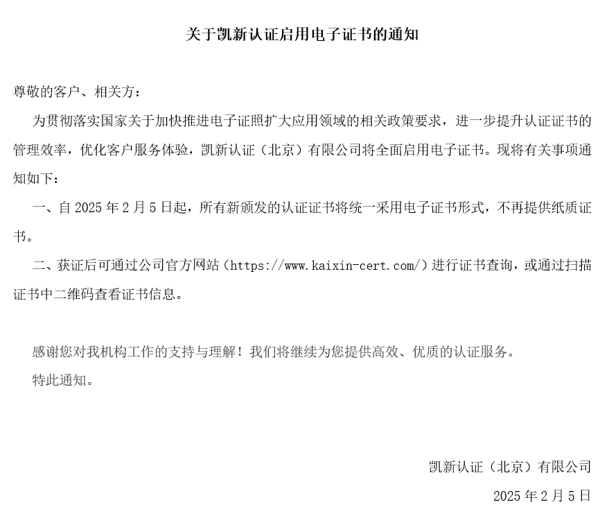 為貫徹落實(shí)國家關(guān)于加快推進(jìn)電子證照擴(kuò)大應(yīng)用領(lǐng)域的相關(guān)政策要求,進(jìn)一步提升認(rèn)證證書的管理效率,優(yōu)化客戶服務(wù)體驗(yàn),凱新認(rèn)證(北京)有限公司將全面啟用電子證書。現(xiàn)將有關(guān)事項(xiàng)通知如下252025-02