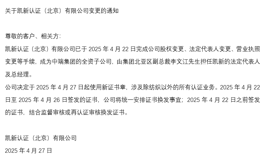 尊敬的客戶(hù)、相關(guān)方: 凱新認(rèn)證(北京)有限公司已于2025年4月22日完成公司股權(quán)變更、法定代表人變更、營(yíng)業(yè)執(zhí)照變更等手續(xù),成為中瑞集團(tuán)的全資子公司,由集團(tuán)北亞區(qū)副總裁李文江先生擔(dān)任凱新的法定代表人及總經(jīng)理。272025-04