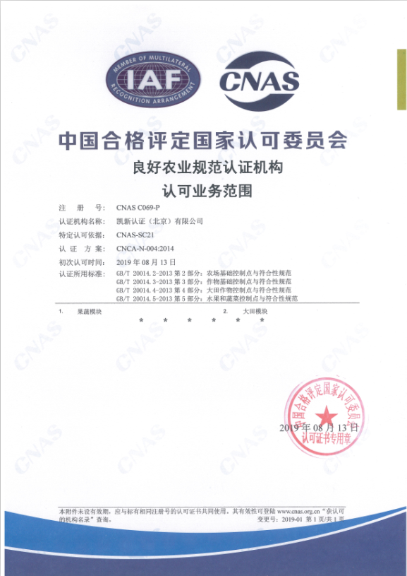 2019年8月13日,有機和良好農業(yè)規(guī)范認證(GAP)領域獲得CNAS認可資格。認可范圍范圍包括: