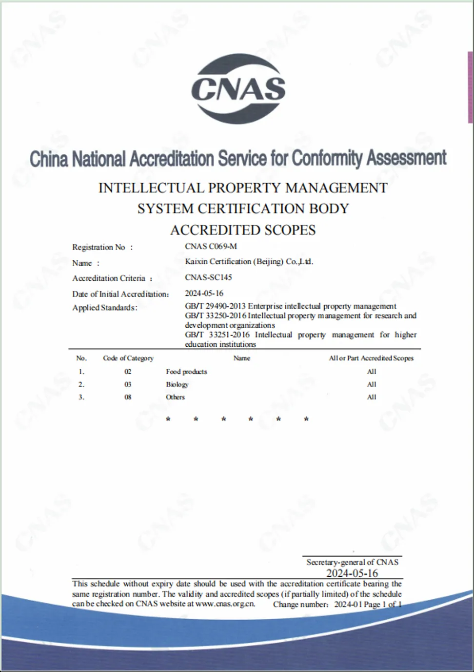 凱新認(rèn)證知識(shí)產(chǎn)權(quán)管理體系(IPMS)于近日獲得CNAS認(rèn)可資格,凱新認(rèn)證在被認(rèn)可的范圍內(nèi),可向客戶發(fā)放帶有CNAS認(rèn)可標(biāo)識(shí)的認(rèn)證證書302024-05