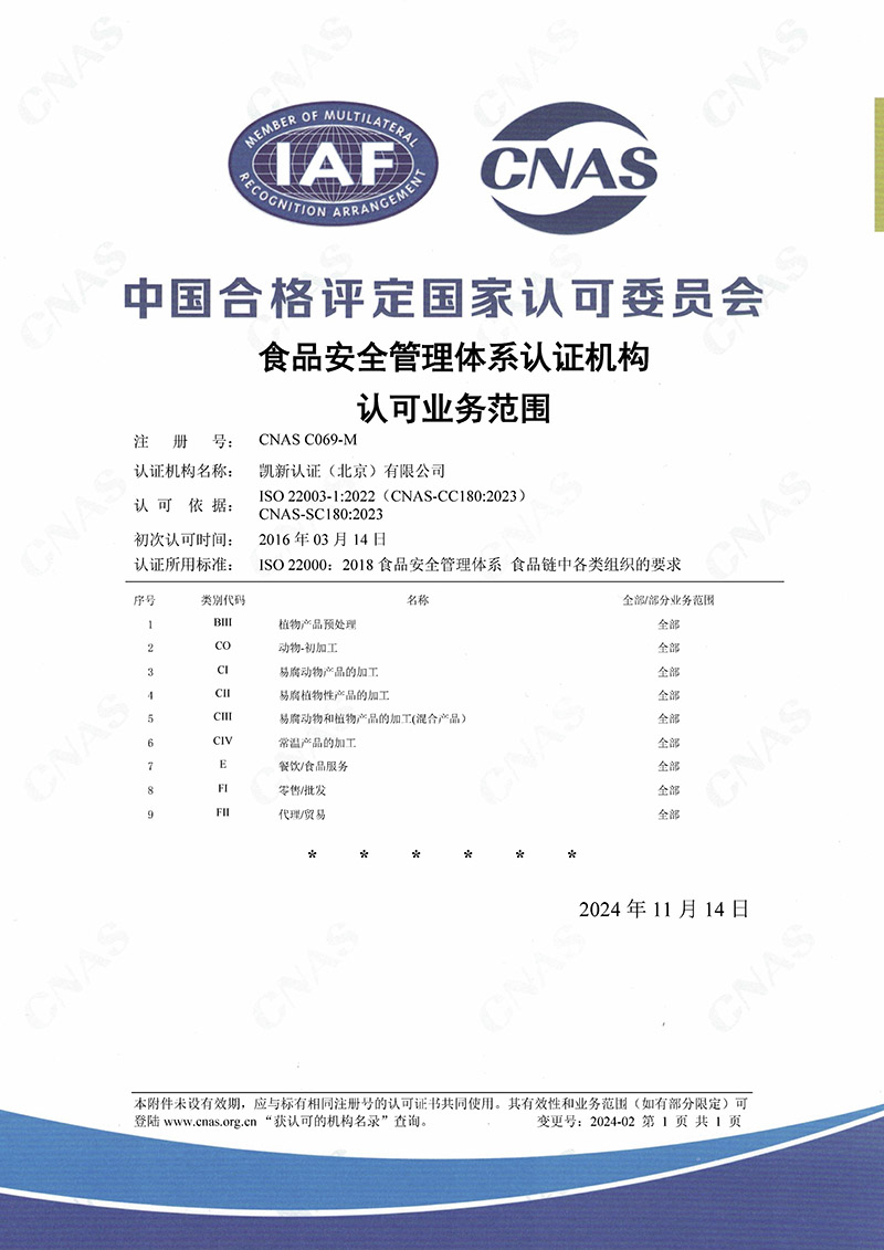 CNAS認(rèn)可HACCP范圍