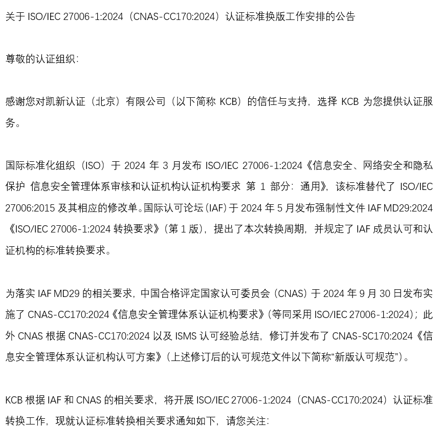 工作通知關(guān)于ISO/IEC 27006-1:2024(CNAS-CC170:2024)認(rèn)證標(biāo)準(zhǔn)換版工作安排的公告