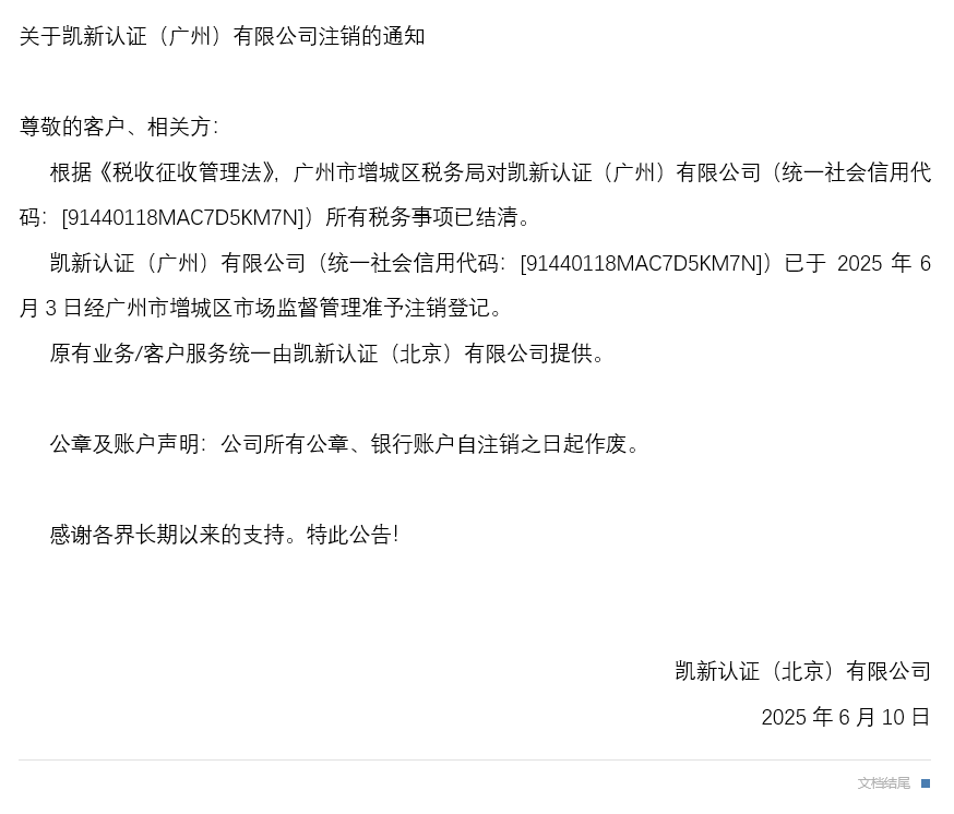 工作通知關(guān)于子公司凱新認(rèn)證(廣州)有限公司注銷(xiāo)的通知
